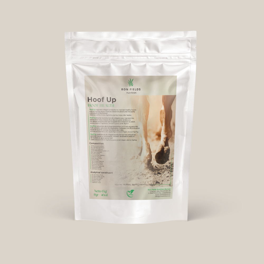 Hoof UP von Ron Fields Nutrition ist ein hochwertiges ayurvedisches Ergänzungsfuttermittel zur Unterstützung starker, belastbarer und gesunder Hufe bei Pferden.
